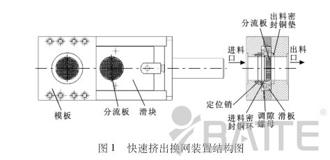 板式換網器結構:它主要過濾部件由滑塊、定位銷、進料密封銅環、調隙螺母、分流板和出料密封銅墊所組成,如圖1所示。調隙螺母主要作用是通過旋轉調節,將進料密封銅環和滑板一端作密封緊配合,防止塑料溶液從進料密封銅環和滑板之間漏出;塑料溶液通過分流板進行過濾,過濾后的塑料溶液通過出料口流出。