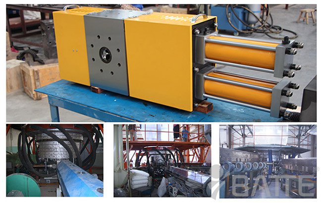 吹膜專用不停機換網器 在大型單層、多層共擠吹膜機組上,應用雙柱不停機換網器;其采用高性能鋼材和非常規加工及熱處理方式,設有穩壓、潤滑及密封機構,穩壓機構在換網時與主網“協同”平抑壓力波動,使濾網切換更平穩。獨特的密封系統和高溫潤滑系統“協同”使換網器主體耐壓40~60MPa,使用4~5年不會出現任何漏料現象。換網時“接力式”自動排氣,不停機、不減速、不漏料、不漏油。